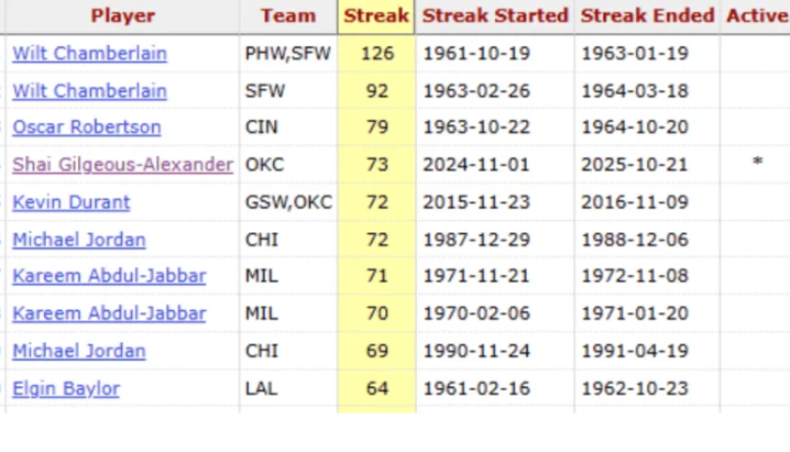 那么这项统计的历史前三是谁呢?历史第三是罗伯特森的连续79场,这个壮举亚历山大有希望赶超。历史第二是张伯伦的连续92场,亚历山大也有希望去挑战一下。