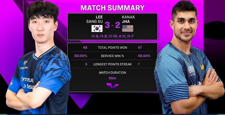 李尚洙这场比赛的表现令人肃然起敬,面对比自己年轻的冲击型选手卡纳克,李尚洙打出了“不让青春”的热血激情。凭借着强势且稳定的中台高速攻击,李尚洙一气呵成先赢下前两局。第三局,李尚洙两次触碰到赛点却均失之交臂,卡纳克乘势连追两局,把比赛拖进决胜局。最后,李尚洙在没有场外教练指导的情况下,冷静拿下致胜局,昂首挺进8强。