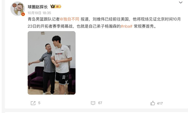 而随着这一场比赛逐渐临近,目前杨瀚森也收到了两个好消息,可以说是双喜临门,这些好消息应该有利于杨瀚森在接下来取得更好的发挥。首先第一个好消息,目前根据权威媒体报道,杨瀚森在青岛男篮的恩师刘维伟已经确定将会出席本次开拓者常规赛的揭幕战,到时候将会在现场观战,为自己的弟子加油打气。这对于杨瀚森而言,其实是一个非常重要的消息。毕竟恩师在底下坐着,杨瀚森可能会打的更加有激情、更加有活力、更加从容,也会想要打出好的成绩来回馈自己的恩师,这也许会在心理层面帮助杨瀚森打好本场比赛。