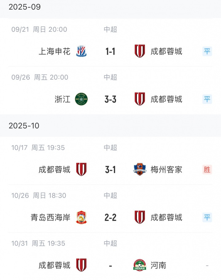 在中超第24轮结束后,蓉城还以2分领跑积分榜。但近5轮1胜3平1负丢了9分,最终导致第29轮直接退出争冠!