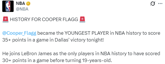 北京时间11月30日,NBA常规赛独行侠背靠背114-110险胜快船,18岁状元郎弗拉格打出生涯最强一战,全场22投13中拿到35分8篮板2助攻,一战连创多项纪录,超越詹姆斯成为史上最年轻35分先生。